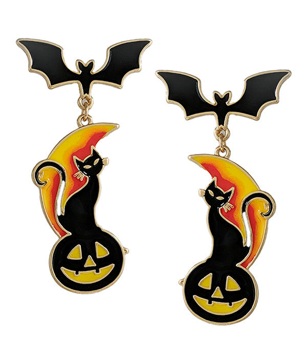 HALLOWEEN THEME MULTI CHARM DROP EARRING - BAT CAT PUMPKIN : Size- 1 X 2 INCHES : Color- GMX